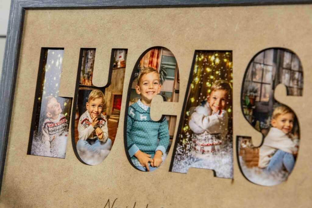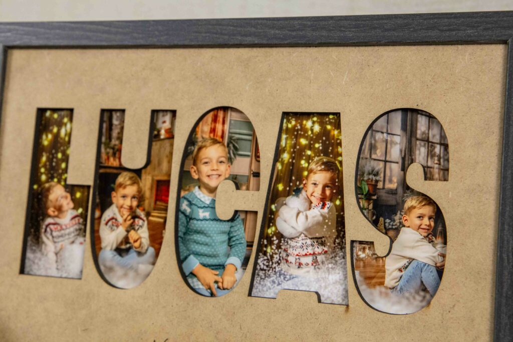 Haz que la magia de la Navidad perdure todo el año con este cuadro personalizado con nombre y fotos navideñas. Cada letra del nombre —como “Lucas” o el que tú elijas— revela una imagen de tu sesión infantil de Navidad en estudio, capturando sonrisas, ilusión y momentos llenos de encanto. ✨