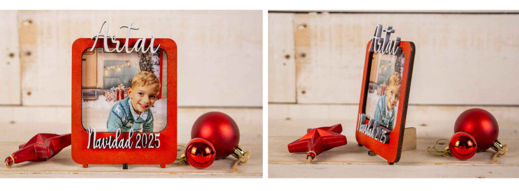 Realizado con madera DM, cortado y grabado con láser, este marco combina el encanto artesanal con detalles festivos únicos.